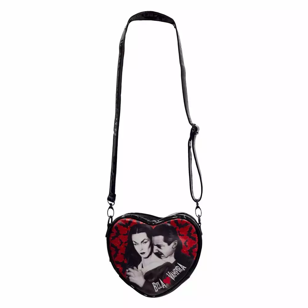 Officially licensed Bela Loves Vampira Mini Heart Purse from our Bela love Vampira line. Wear it any way you want! Comes with removable wrist and shoulder strap, so you can use it has a wristlet, shoulder bag or crossbody. made from Shiny PU bag measures 6.75″ tall, 7.5″ wide and 2.75″ deep