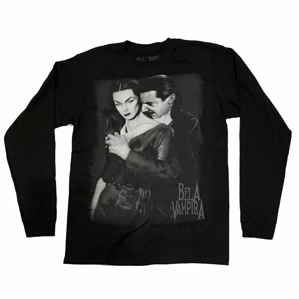 It’s love at first bite with this long sleeve from Kreepsville’s Bela loves Vampira line show your love for vintage horror with this shirt. Featuring horror classic Bela Lugosi sinking his teeth into the original glamor ghoul Vampira. Made out of 100% cotton in the USA.