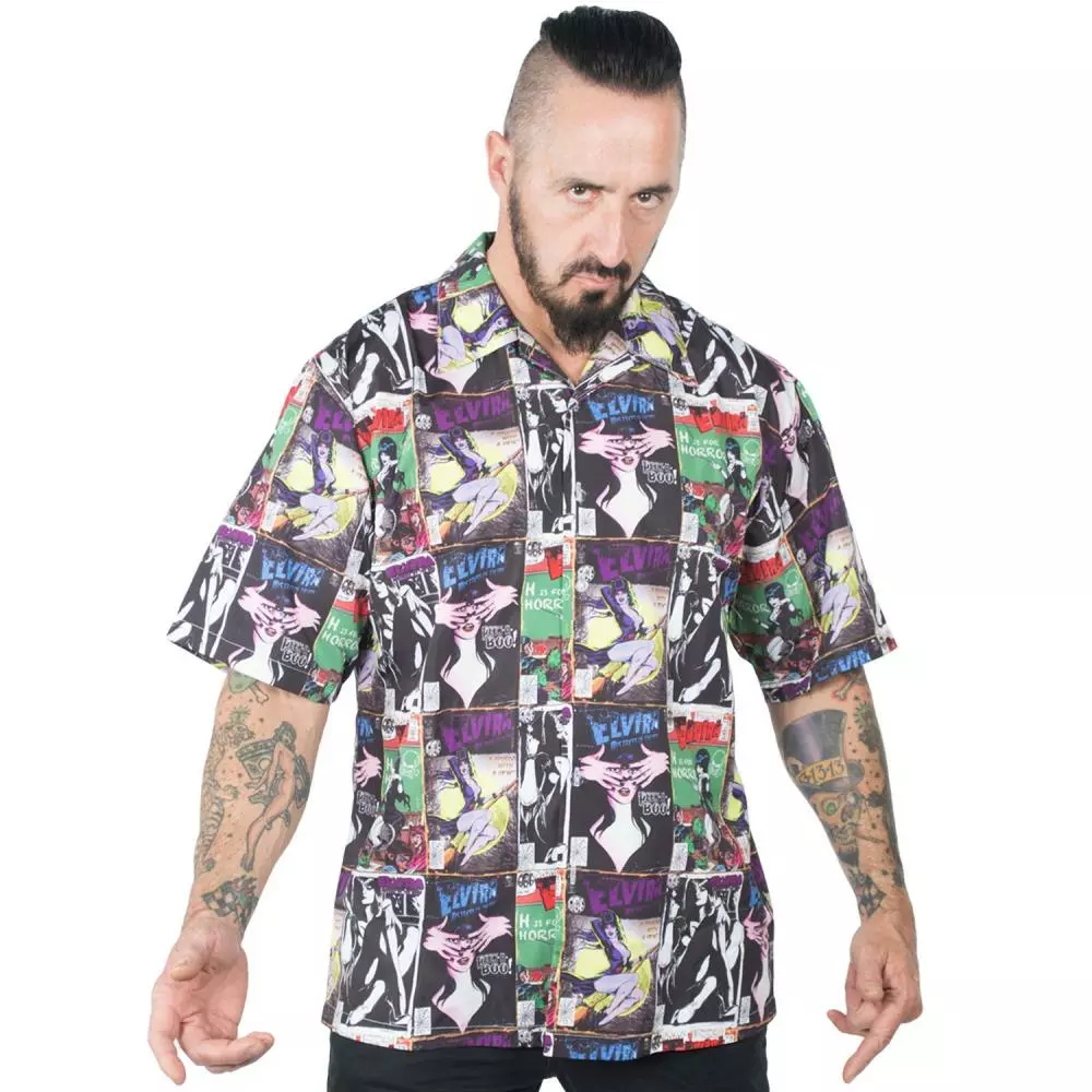 Official Elvira Mistress of the Dark men’s all over print button down shirt. Loose fit sublimated silk feel shirt featuring all over comic book art of Elvira. 100% polyester shirt.