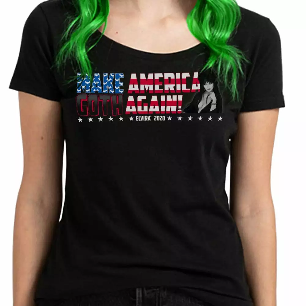 Official licensed Elvira Mistress of the Dark Make America Goth Again Campaign Merch womens cut T-Shirt. 100% Cotton screened t-shirt , Printed in the USA.