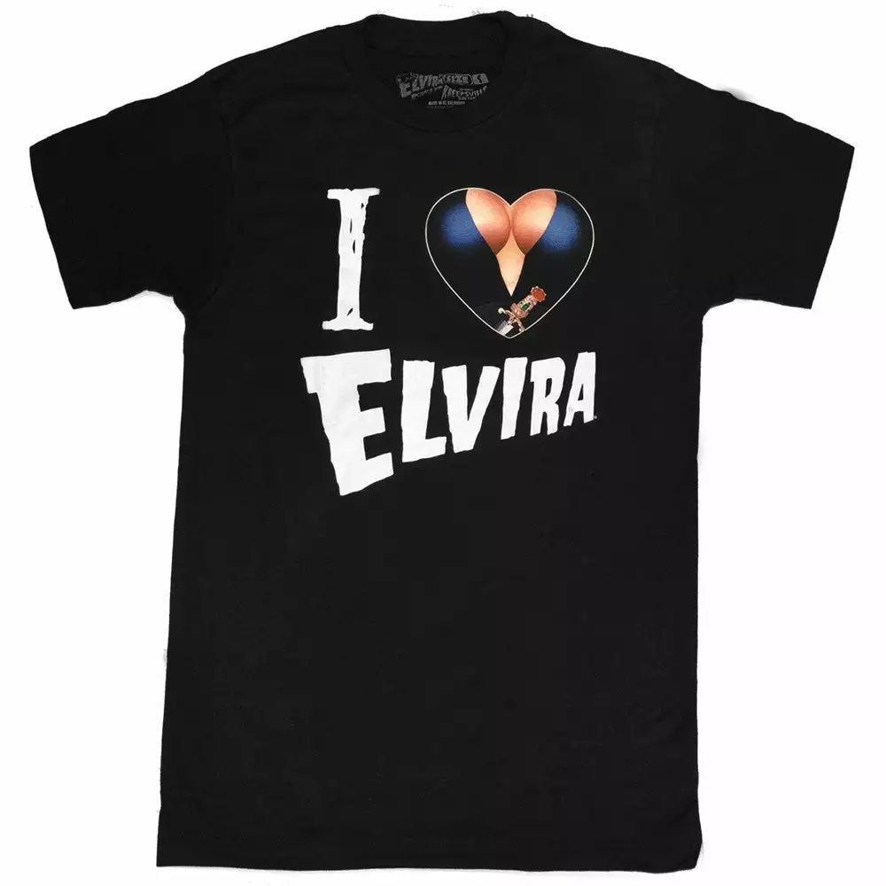 Official Elvira Mistress of the Dark heart tshirt. Show your love for the mistress with this I heart Elvira Tshirt ! Discharged print on black 100% cotton tshirt , made in the USA by Kreepsville.