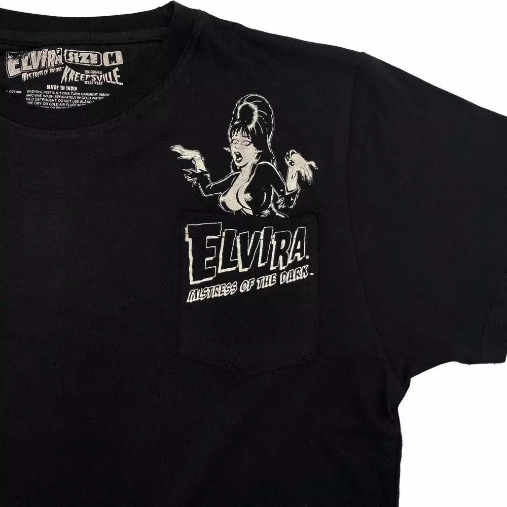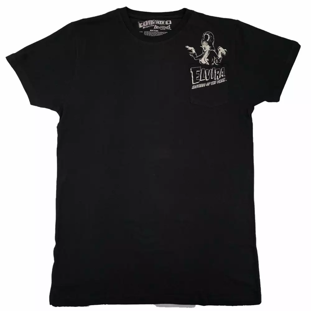 Elvira is busting out….of the Pocket Elvira Pocket T-shirt! All black 100% cotton tee shirt with a pocket featuring Elvira printed above it and Elvira logo printed on the pocket!
