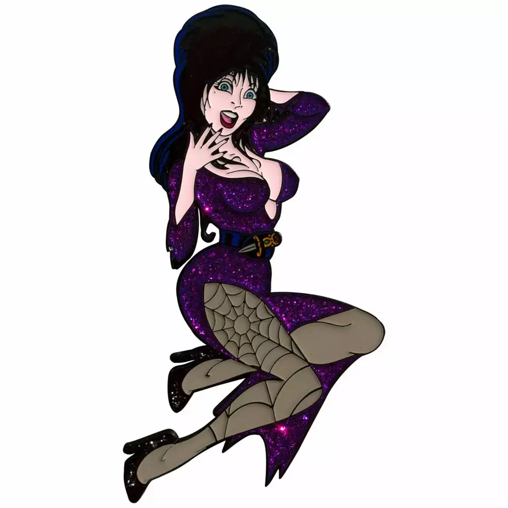 Special release official Elvira Mistress of the Dark enamel pin. XL size pin 3.5″ (9cm) high. With poison purple glitter dress and glitter shoe detail.