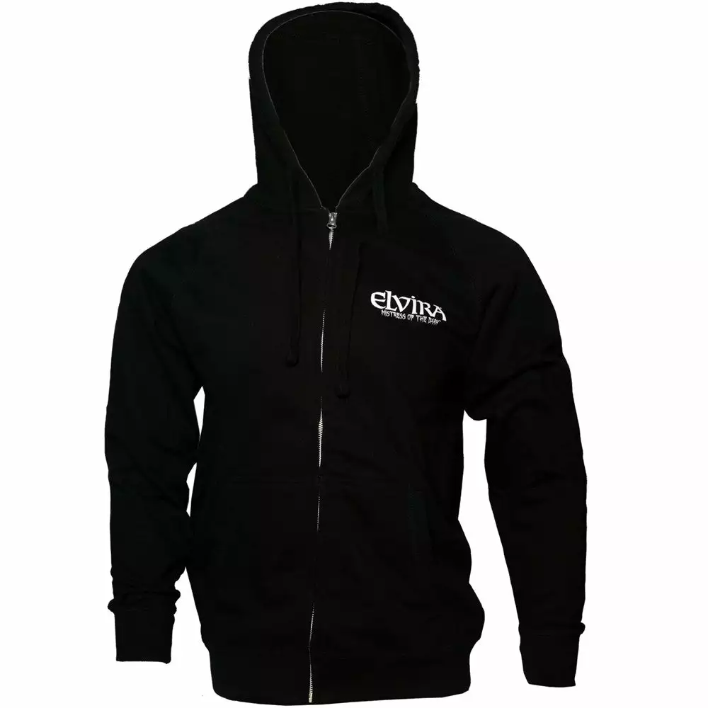 Official Elvira Mistress of the Dark unisex hoody, lightweight zip up hoody with Elvira front logo and Elvira Rockers backprint. Hoody 80% cotton, 20% polyester. Made in the USA by Kreepsville.