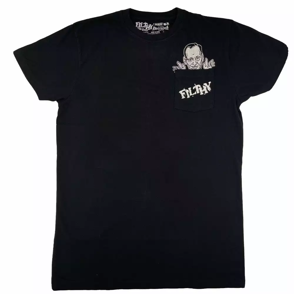 Get Flithy with our John Waters Pocket T-shirt! All black 100% cotton tee shirt with a pocket featuring John waters printed above it and “filthy” printed on the pocket! Unisex T-shirt