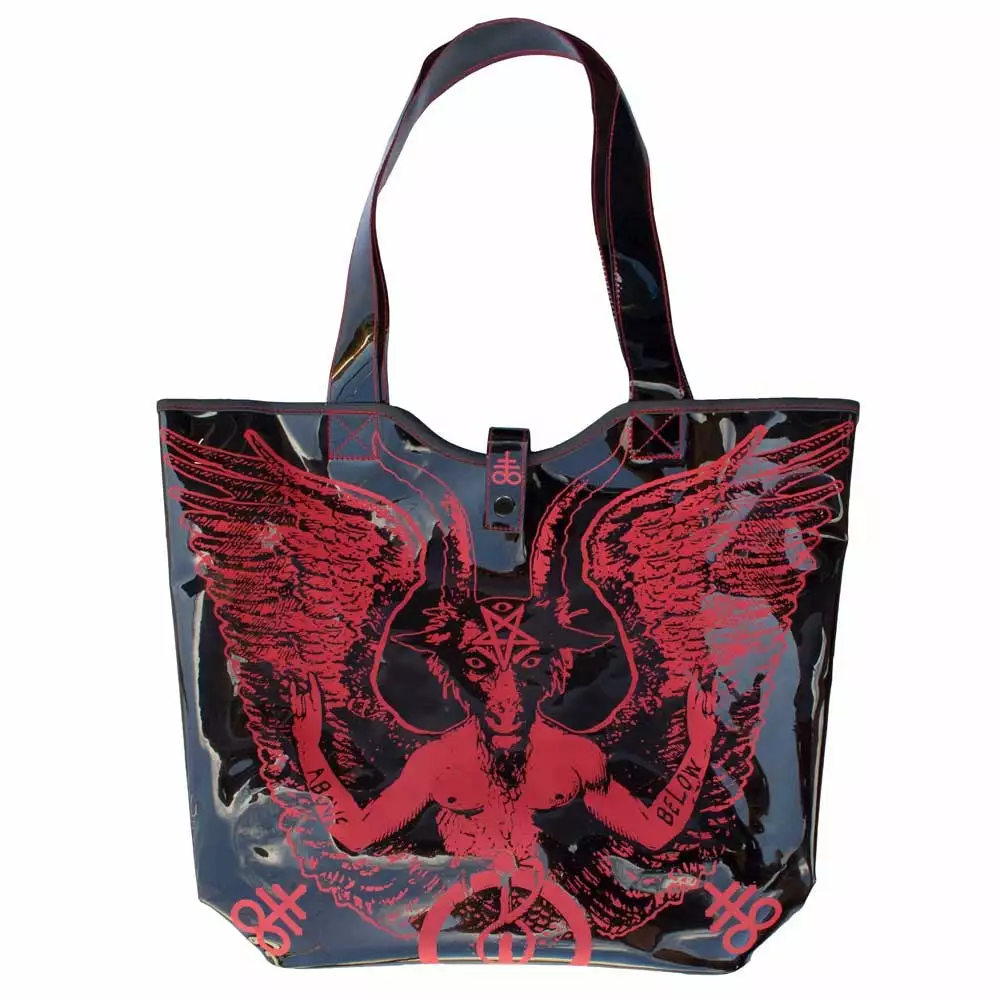 Bring Baphomet to the beach with our Baphomet Satanic PVC Beach Tote. Tote is made of translucent PVC with a satanic Baphomet print an snap closure. Tote Measures 19in (48cm) W x 15in (38cm) x 5in (33cm x 13cm)