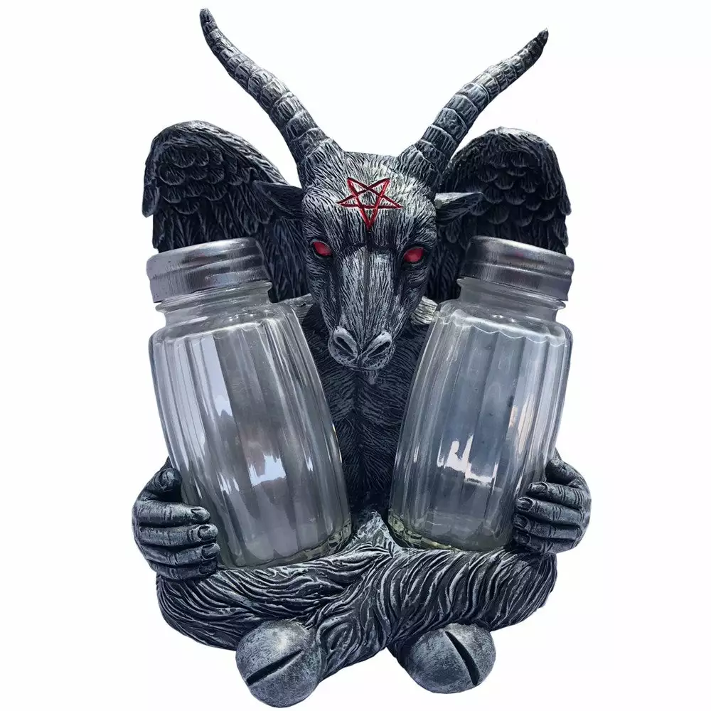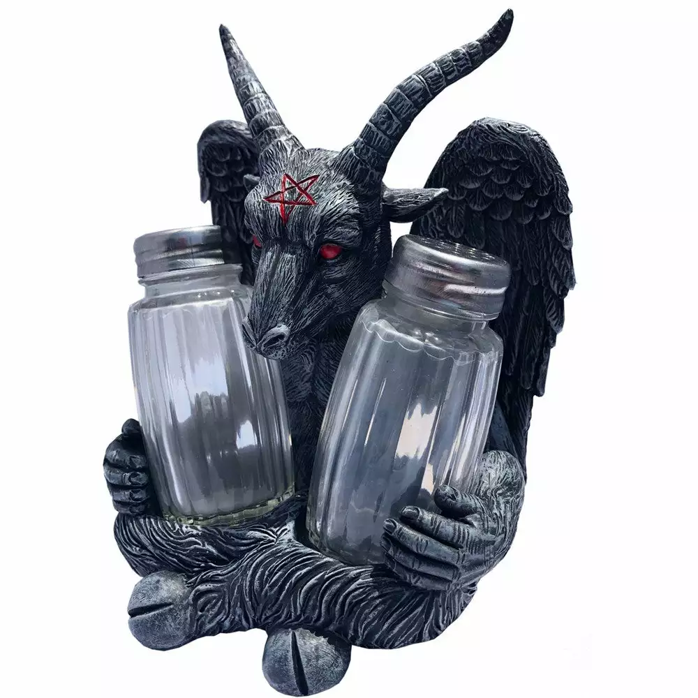 Shake it with with Satan! Spice up your kitchen with these Baphomet salt and pepper shakers! Featuring two 3 inch glass salt and pepper shakers on a resin Baphomet sculpture measuring 6.5 inches tall and 5 inches wide!