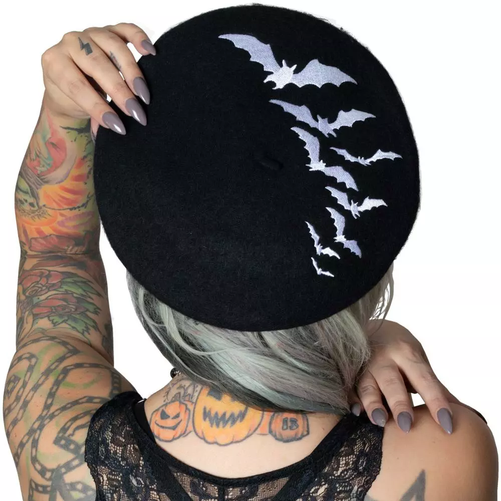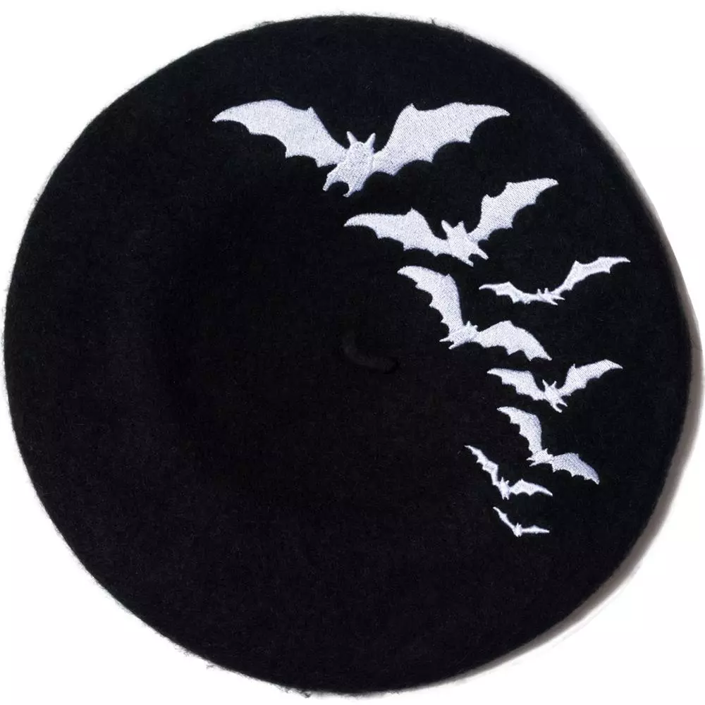 Go batty with Kreepsville’s beatnik berets! 90% wool 10% polyester berets, embroidered bat motif on top and front. One size fits most.