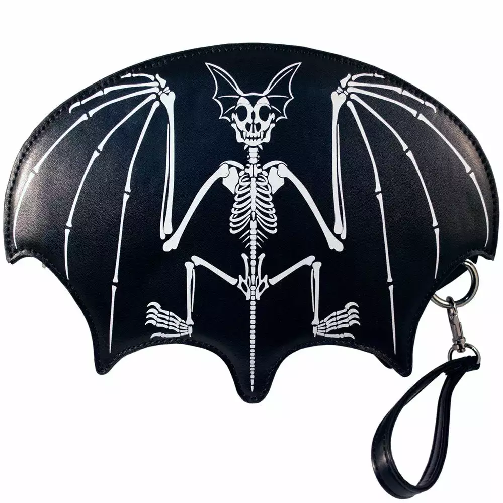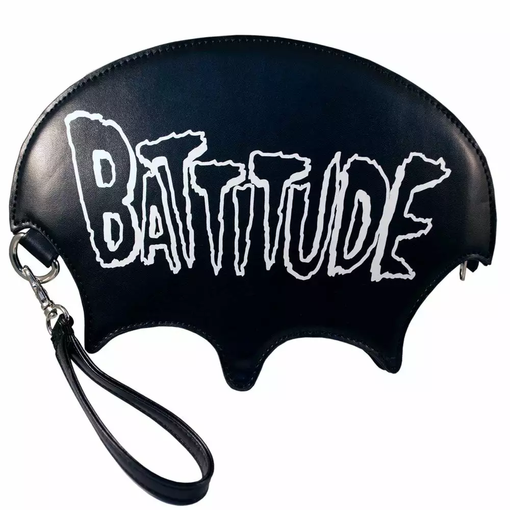 This Wristlet is BAT to the bone! Kreepsville 666 Battitude Wristlet is bat shaped with our skeli-bat printed on the front and “Battitude” printed on the back. Includes detachable shoulder strap. 9.5 inch wing span by 7 inches.