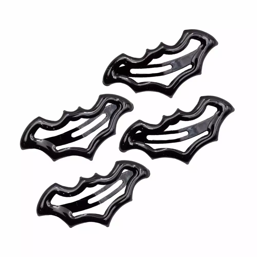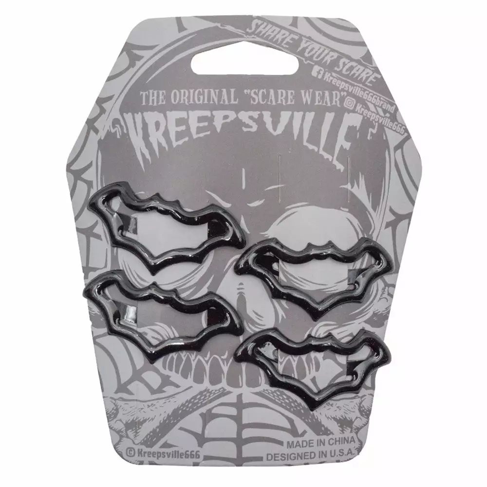 Kreepsville Snap Hair Clips Black. Whether you’re a fresh out of the coffin or a veteran vampire, feel cute and spooky in our bat shaped hair clips! Set of 4 clips. Made with alloy metal with sparkly glitter gloss gel finish. Designed by ghouls in the USA! Clip size: 2″ (5cm) x .9″ (2.2cm).