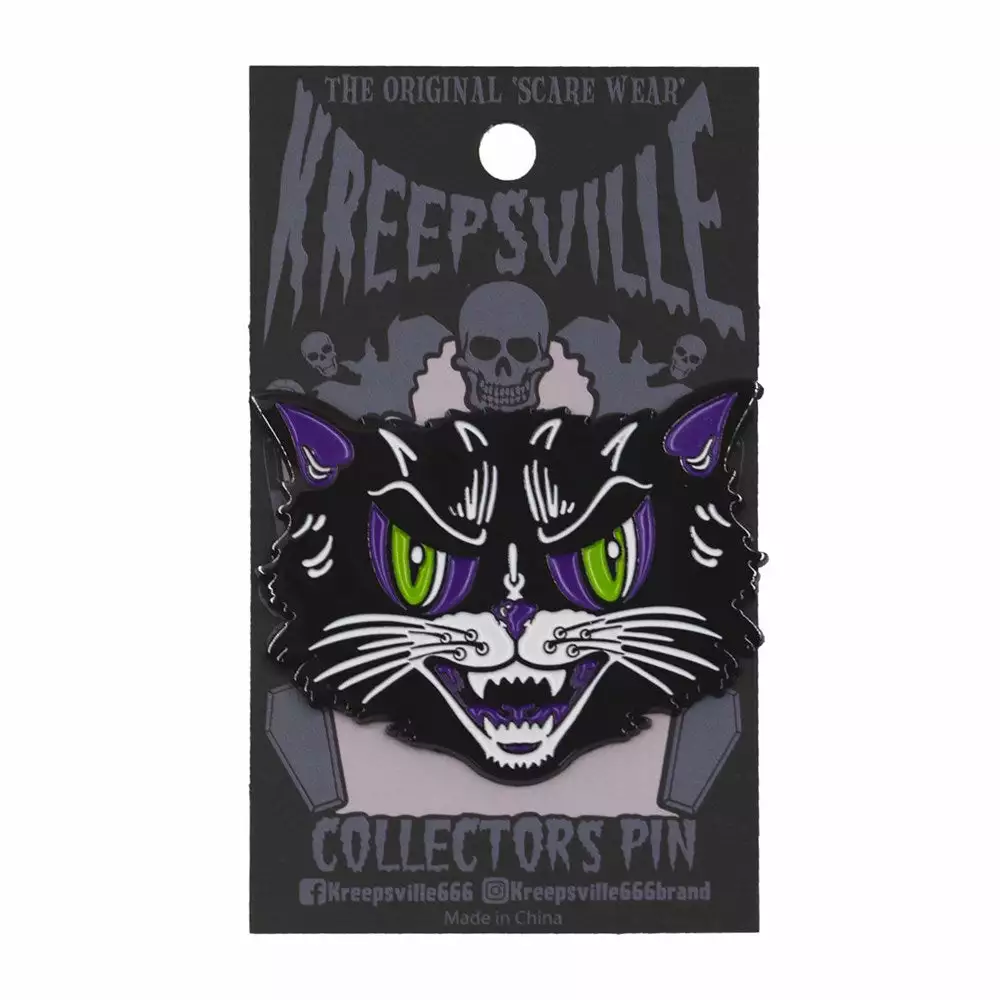 Kreepsville Kattitude enamel pin, cute cat twist to classic vintage Halloween, approx 2″ L (5cm) x 1.5 ” W (4.5cm).