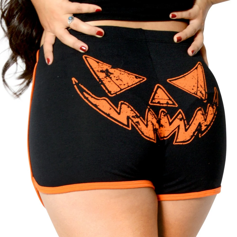 Kreepsville 666 Pumpkin Trick Or Treat Womens Running Shorts! Everyday is Halloween! These shorts feature A pumpkin print on the front a jack o lantern printed on the back with orange contrast piping on the edges. Made from 95% cotton 5% spandex. Made in the USA.