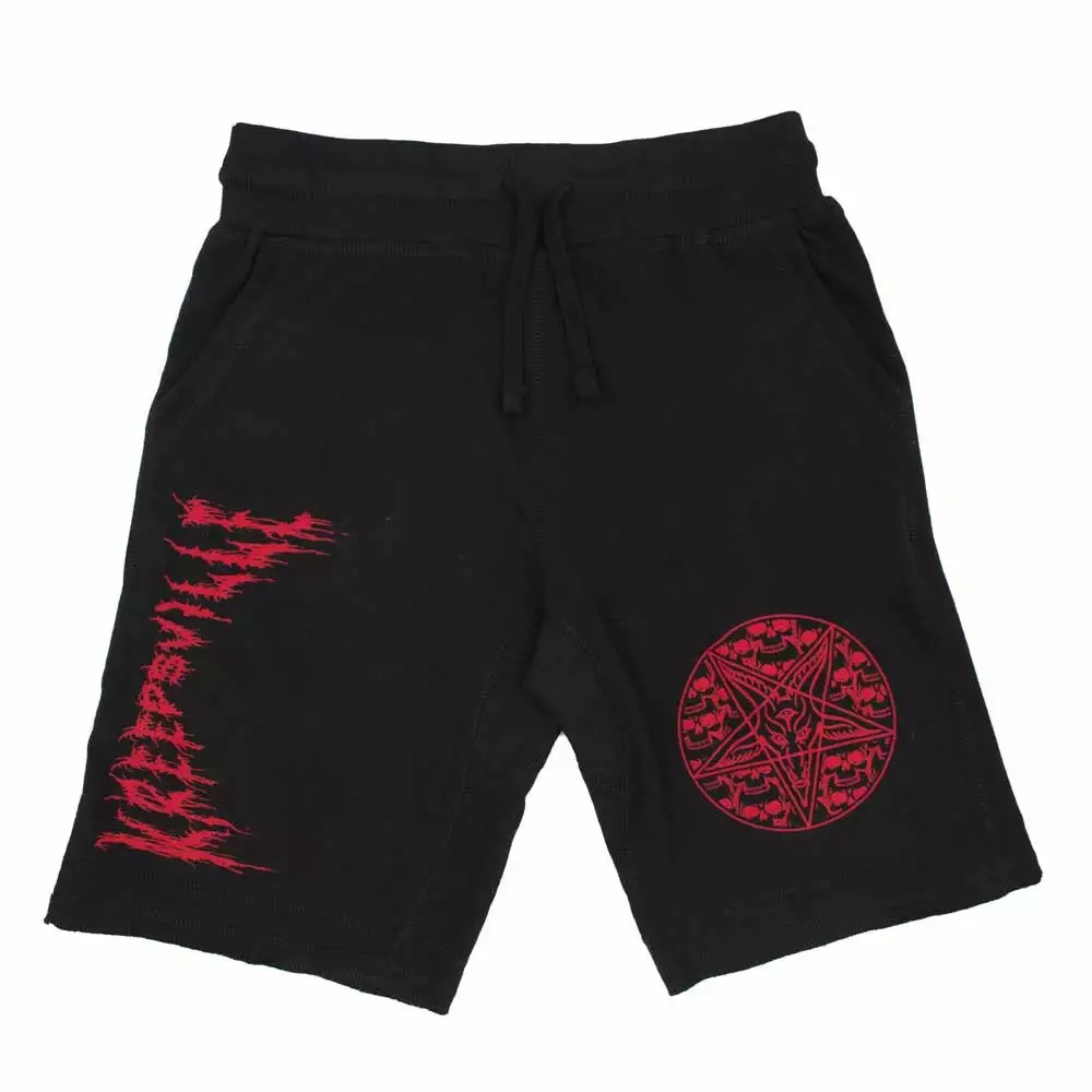 Kreepsville 666 Men’s Satanic Circle Shorts! These shorts feature A goat head pentagram print on one leg and the word “kreepsville” printed on the other with two front pockets, one back pocket, and a drawstring on the waistband. Made from 95% cotton 5% spandex. Made in the USA.