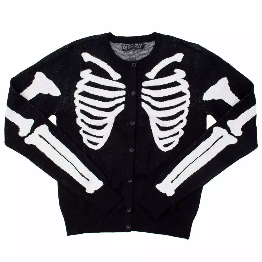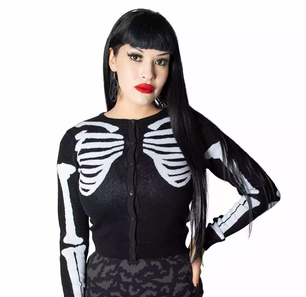 Kreepsville button down Skeleton Ribcage Bones Cardigan , with white knit ribcage design on the front and back and bone details down the sleeves made out of 100% cotton.