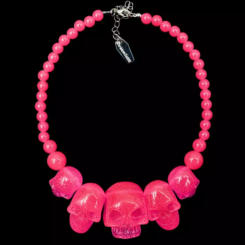 Kreepsville Skull Collection necklace in pink glitter, semi-transparent resin skull beads mixed with pink glitter through out with neck extender and coffin charm, size of large skull approx 1.75″ high