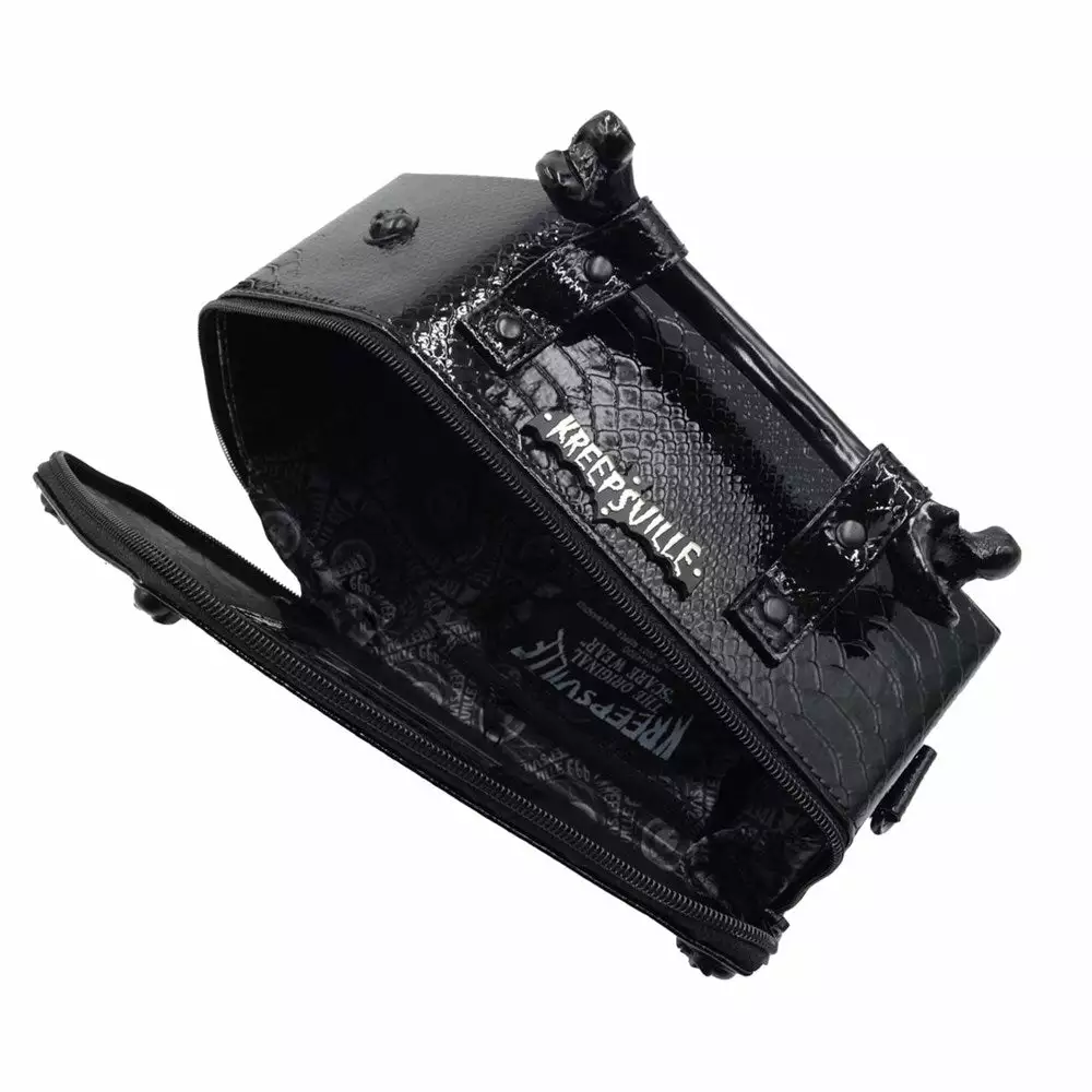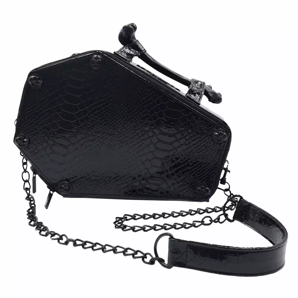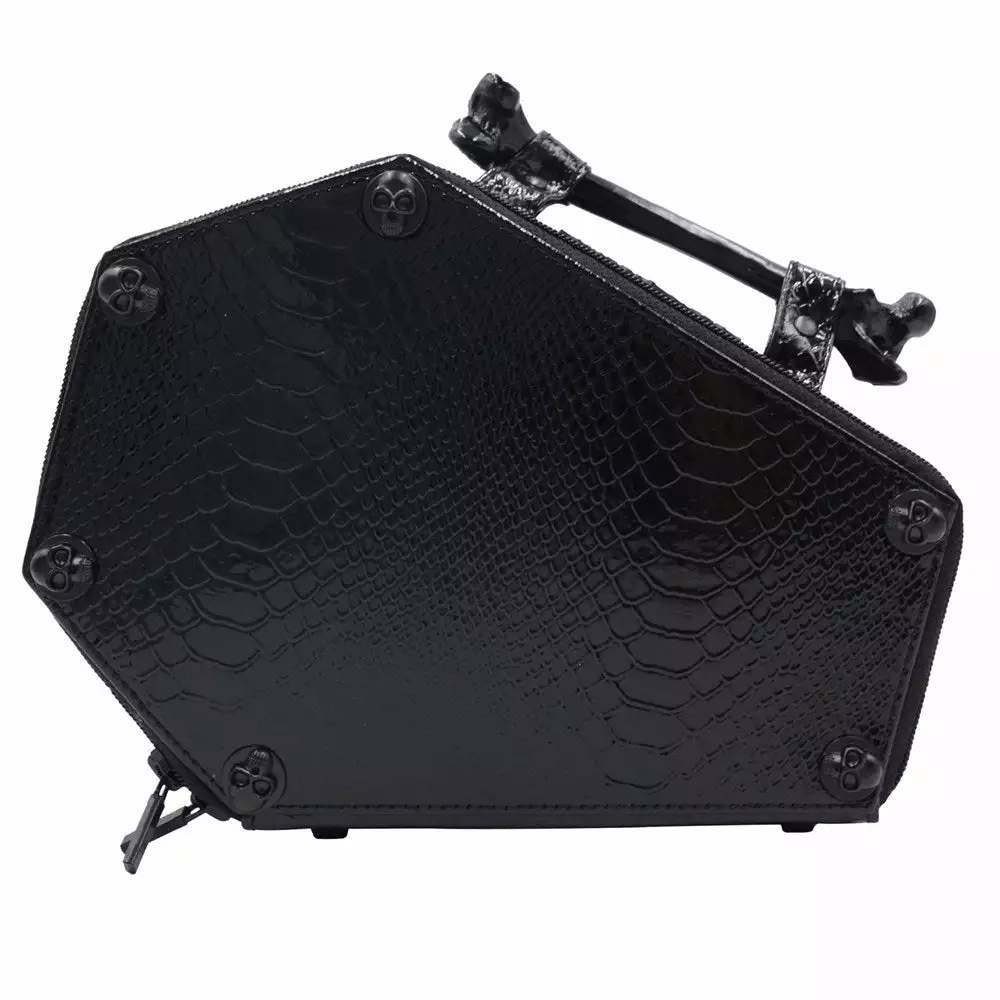 Revamp of our classic style! Kreepsville 666 coffin purse bag with replica bone side handle, super shiny croc skin PU fabric with black skull studs, detachable shoulder strap chain and inside ID pocket. coffin shaped zipper pulls. size approx 10 in wide (25cm) x 7.5 in high (18cm) x 4 in deep (9cm). Go dig our new coffin handbag!