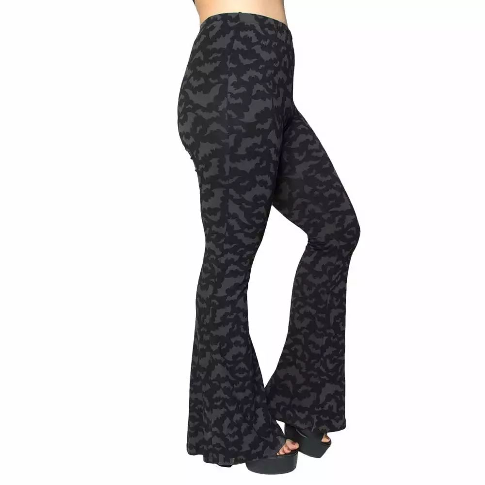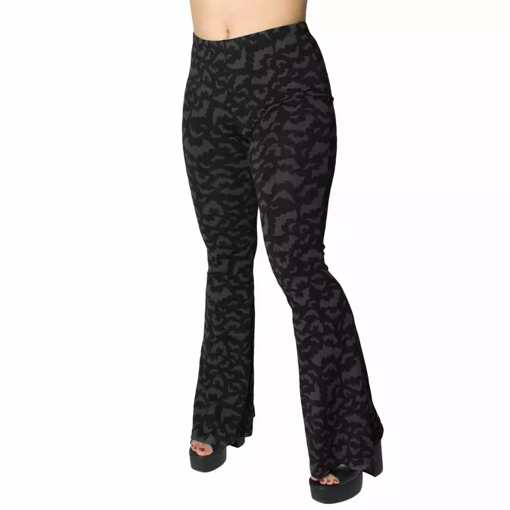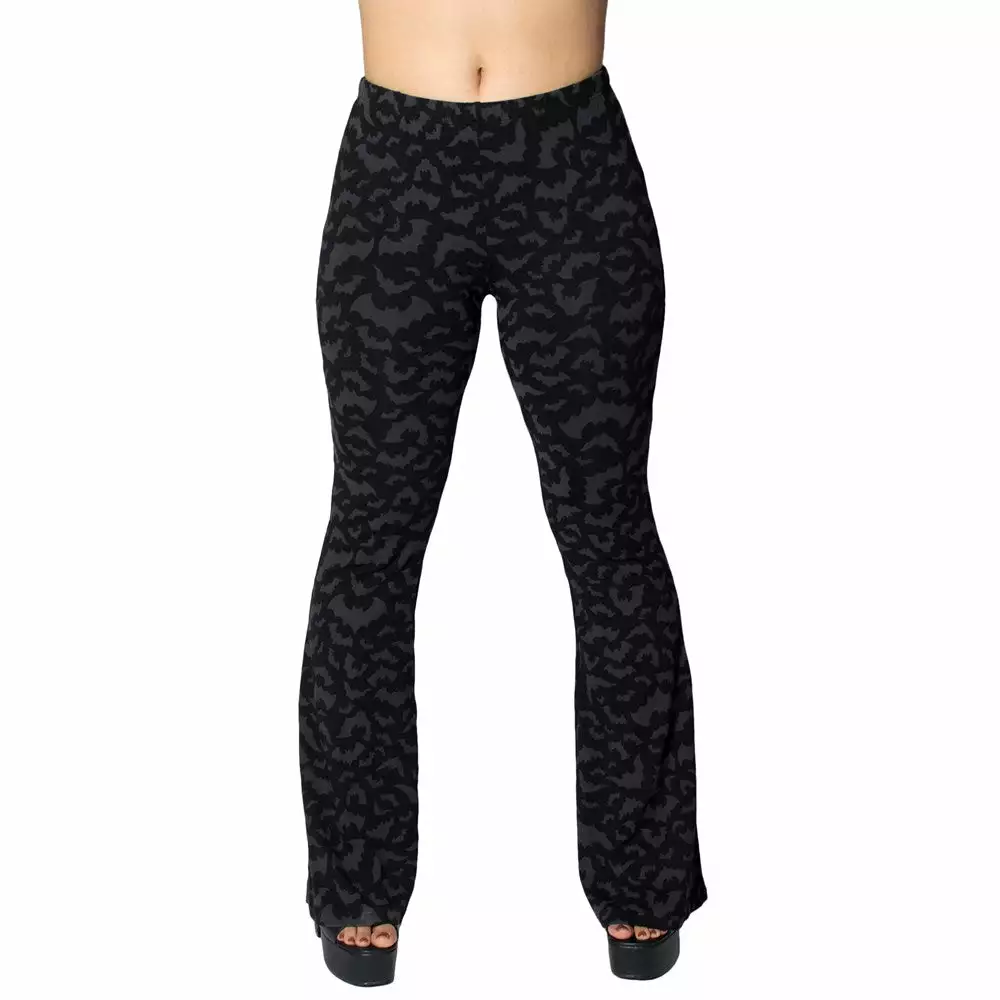 Flare leggings have gone batty! Bat Repeat Flare Leggings black 95% cotton and 5% spandex flare legging with a dark grey all over bat print. Made by monsters in the USA.