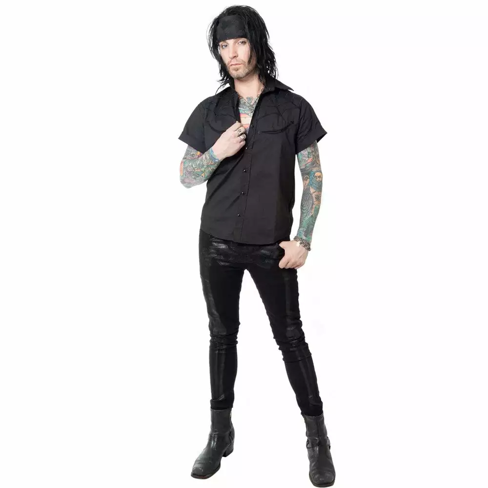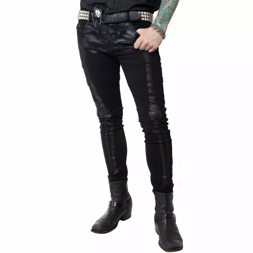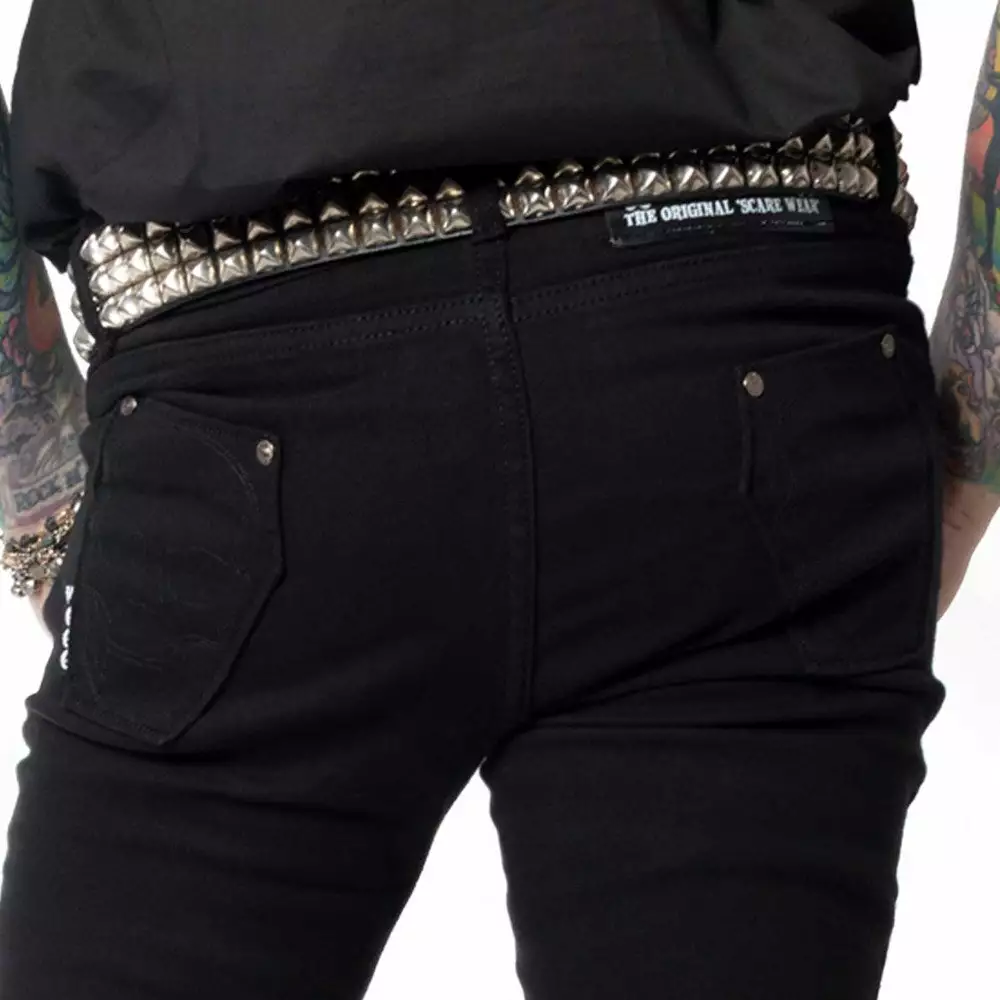 Bad to the bone skeli jeans are back! Black on black Skeli-bone printed on a medium rise 98% cotton 2% Lycra jeans. featuring back pockets with coffin pockets embroidered with skulls.