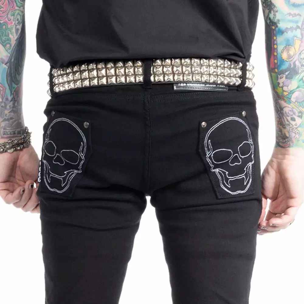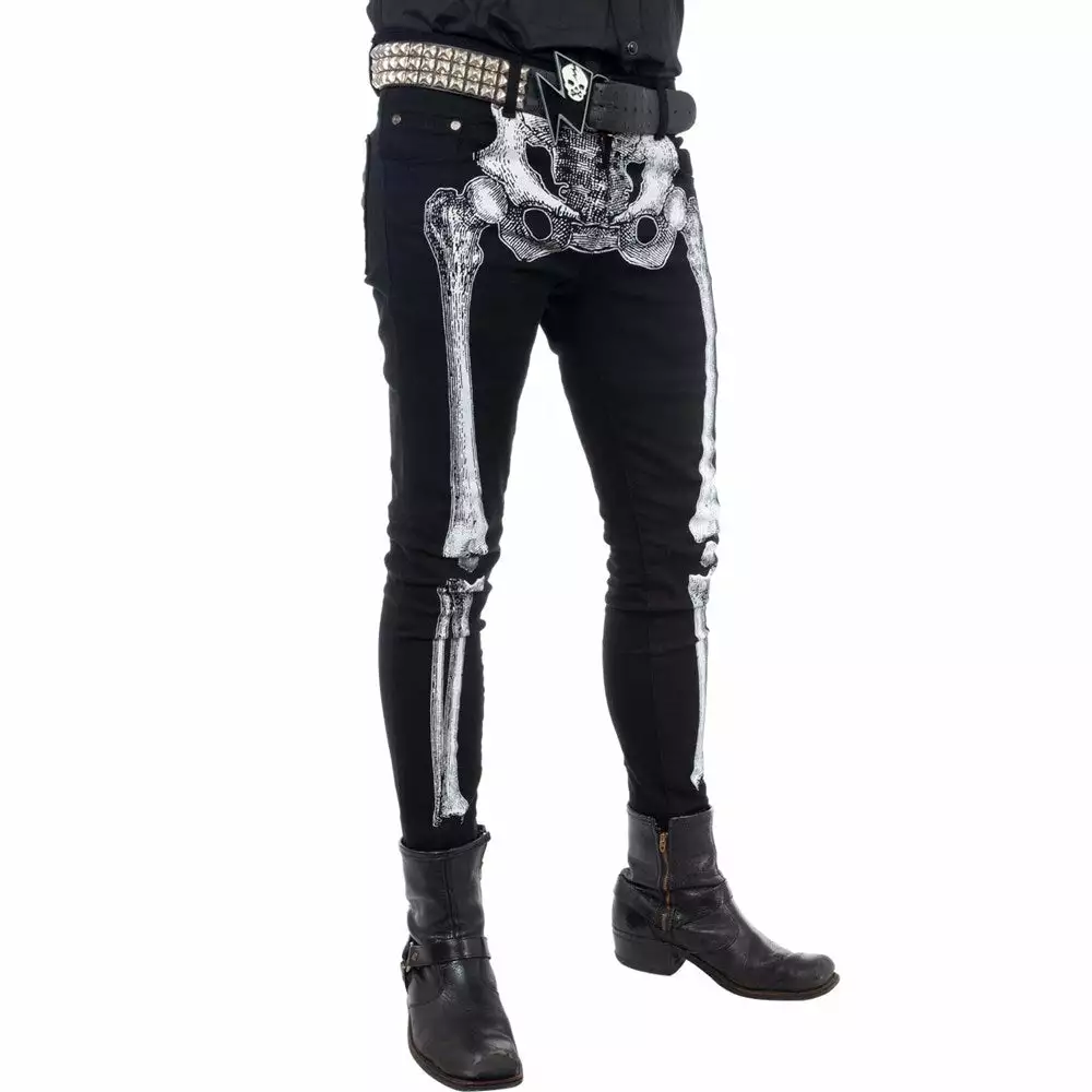 Bad to the bone skeli jeans are back! White Skeli-bone printed on a medium rise 98% cotton 2% Lycra jeans. featuring back pockets with coffin pockets embroidered with skulls.