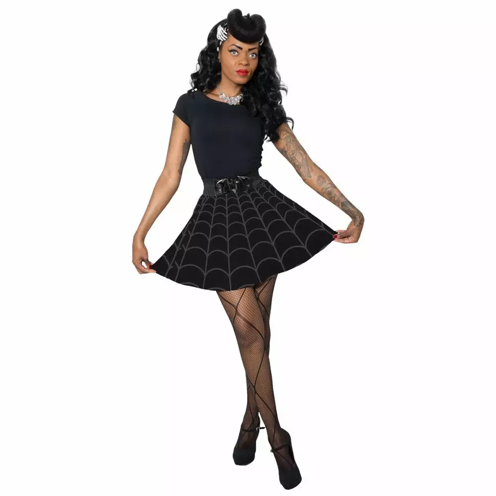 Be the envy of all your friends in this Kreepsville Ghoulish Grey Web Skater Skirt! This skirt will entagle you into its spooky web design, you’ll never want to take it off! Its flattering flared shape and wide elastic waistband make this skirt comfortable and easy to wear giving you that iconic Kreepsville look that you’ll love. A soft feel discharge print made of 95% cotton and 5% spandex. Made in the USA.