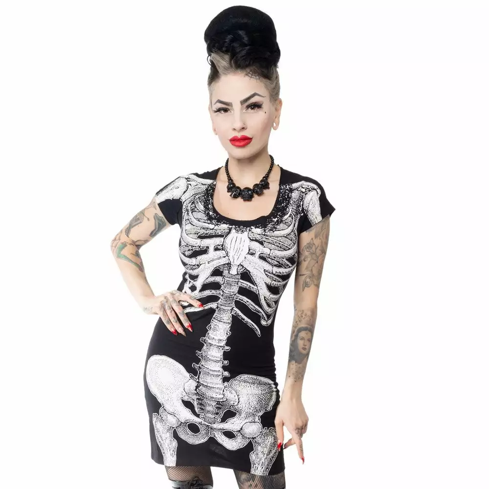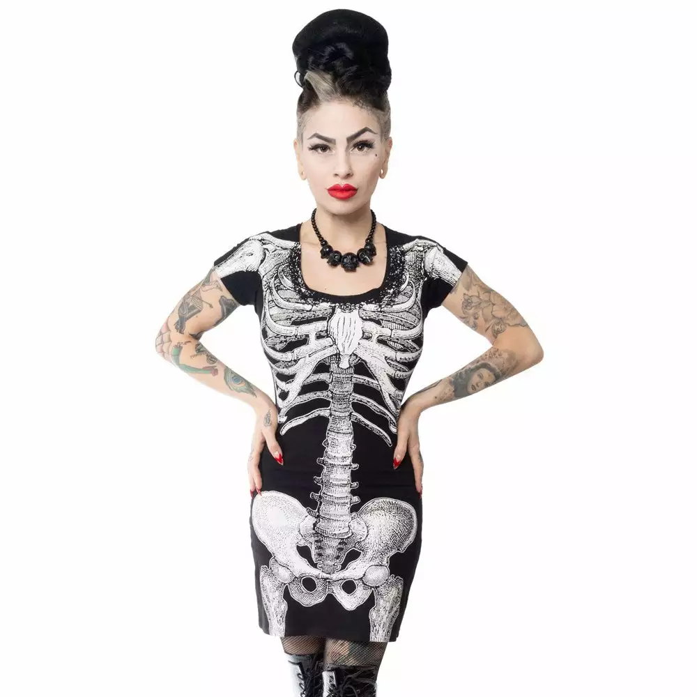 Kreepsville 666 classic skeleton bone dress, 95% cotton 5%spandex fitted tunic dress with discharged anatomical skeleton bones , made in the USA