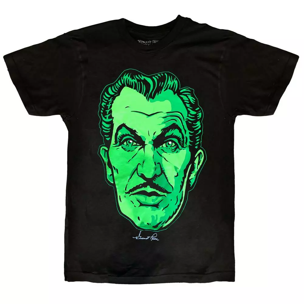 Official Vincent Price Classic Face T-shirt, Vincent Price portrait in ghoulish green by Count Porl. 100% cotton, Screen printed in the USA. Art work by Porl Mchale.